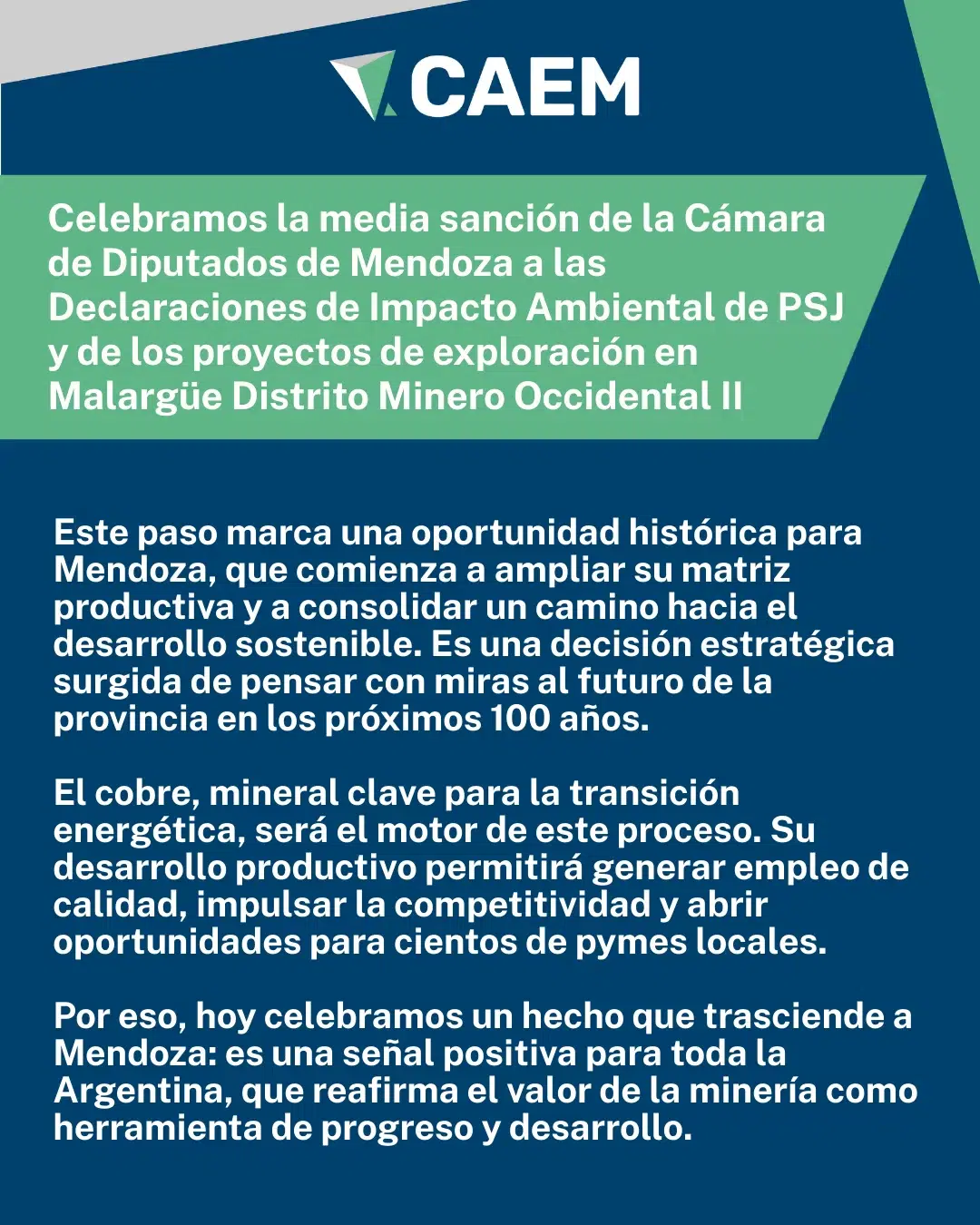 CAEM señaló que el impulso a la actividad minera puede contribuir a diversificar la matriz económica de Mendoza y fortalecer su competitividad. También remarcó que el cobre es un mineral clave para la transición energética, lo que abre oportunidades de inversión y empleo de calidad.