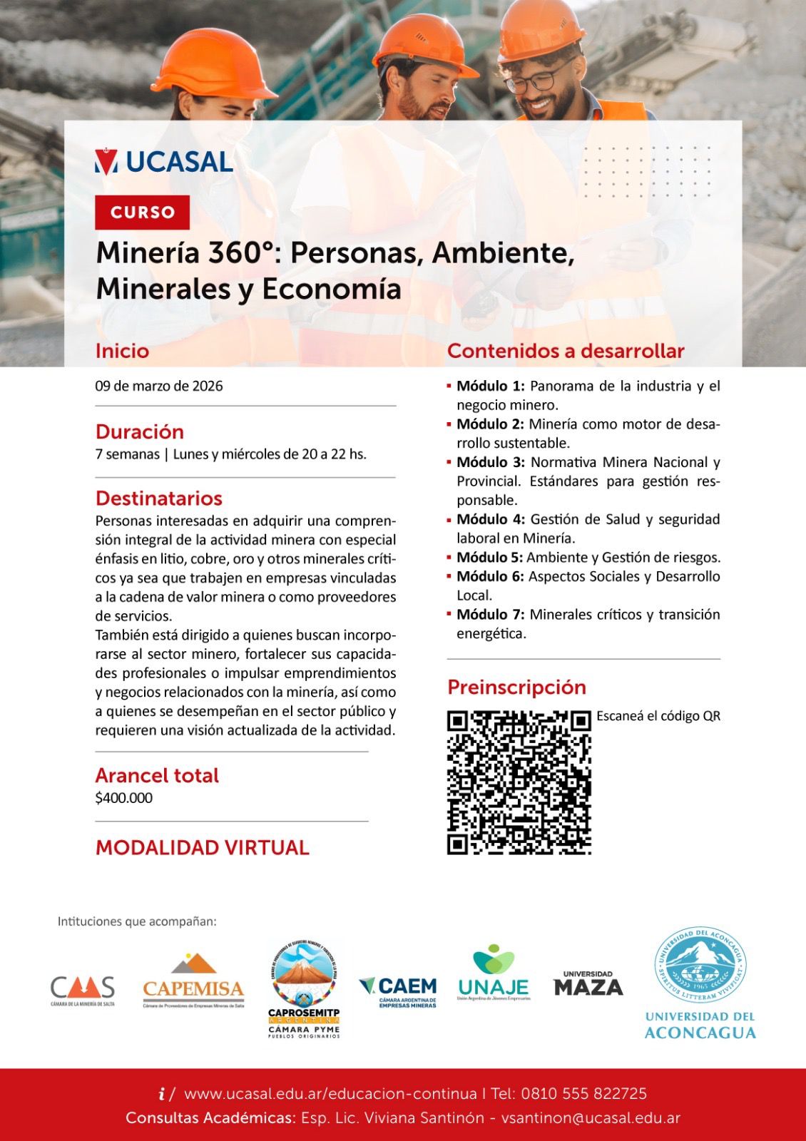 La Universidad Católica de Salta (UCASAL) abre las inscripciones para una nueva apuesta educativa diseñada para quienes buscan insertarse o profundizar sus conocimientos en la industria minera. Viviana Santinón, coordinadora del curso «Minería 360°: Personas, Ambiente, Minerales y Economía», destacó que esta propuesta surge de la necesidad de capacitaciones breves, precisas y con modalidad virtual (sincrónica y asincrónica) para adaptarse a la demanda actual del mercado.